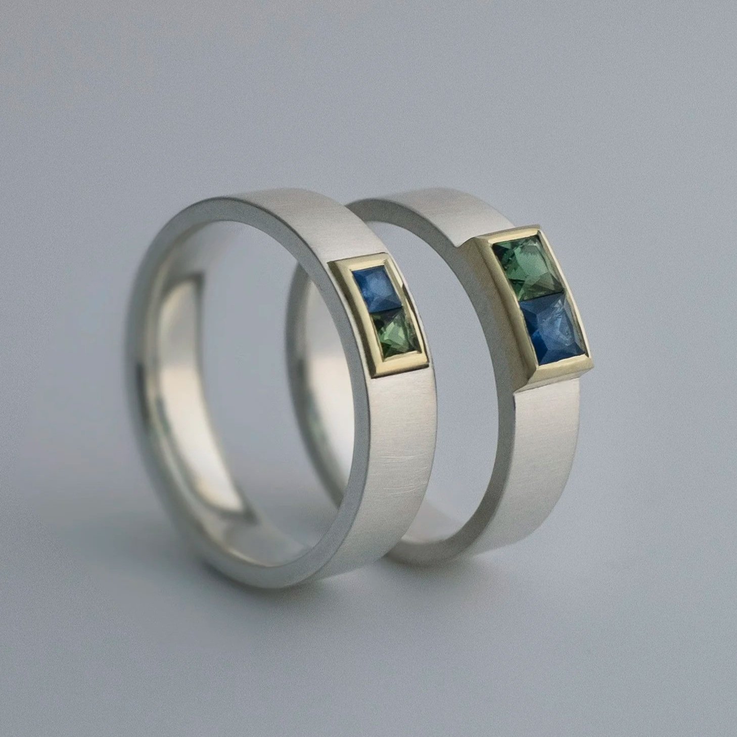 Silver wedding bands with princess cut sapphires and tourmalines set in gold. They represent the eyes of the wearers: she has blue eyes, he has green. Handmade in Amsterdam.